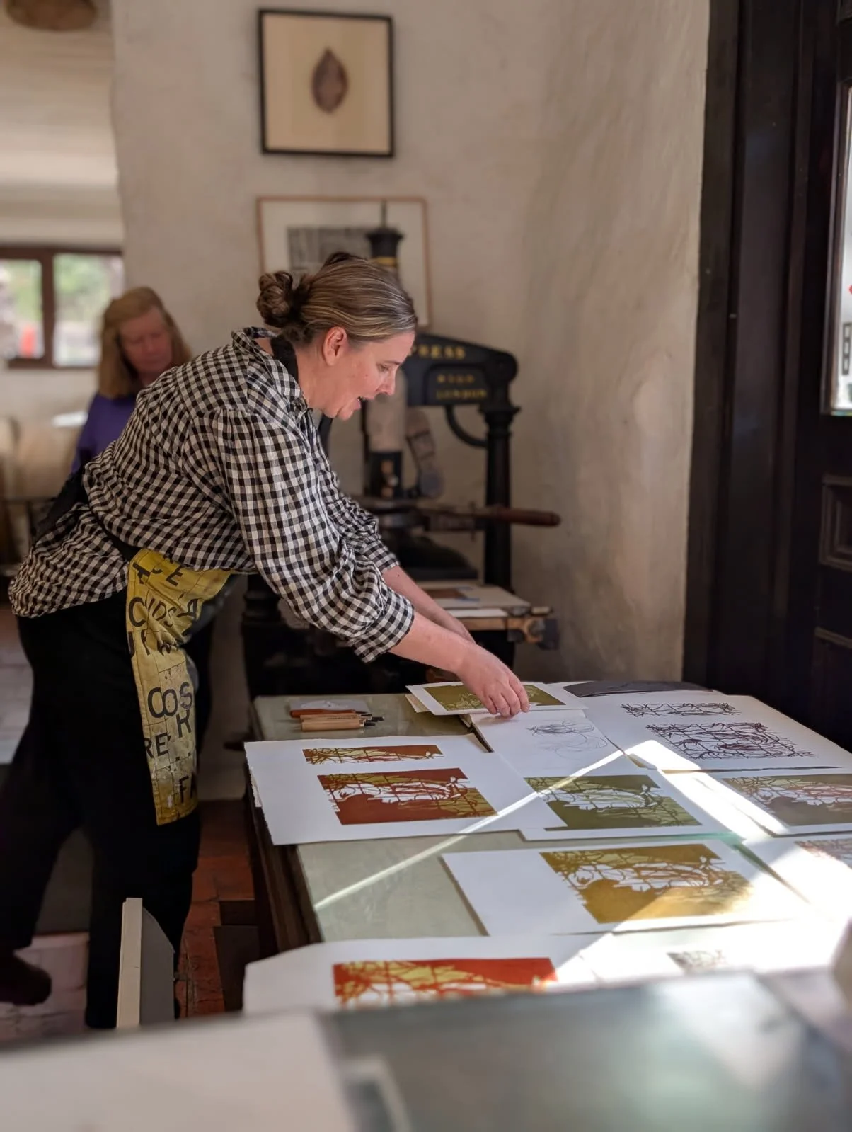 It was this light I challenged myself to set in print - could I capture the backlit silhouettes in a linocut? I limited myself to three colours (Light Green, Raw Sienna, Alazarin Madder Lake) and really enjoyed the endless colour combinations and speed at which linocut printmaking can test ideas.